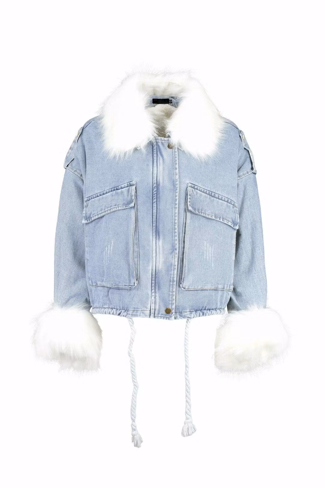 - Dekorerad med fuskpäls på krage och vid ärmöppning