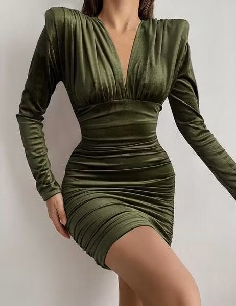 The Bossa Velvet Dress offers a fashionable, timeless look. Crafted from quality velvet, this green dress features a v-neck and strategic shoulder pads. Enjoy the contemporary, comfortable fit while making a stylish impression.