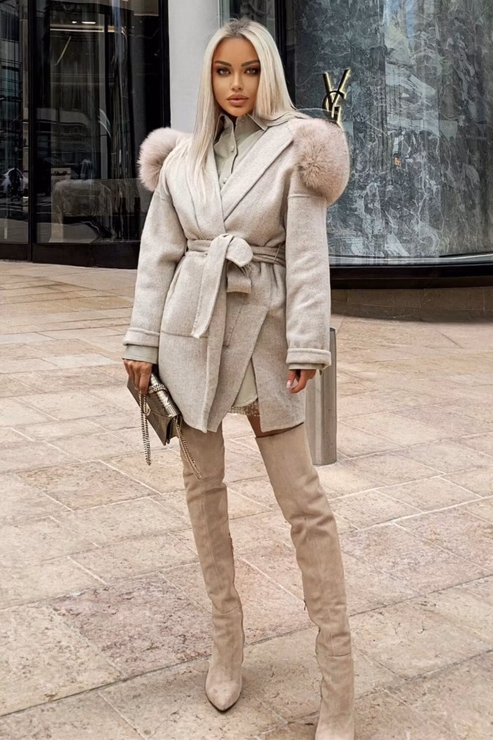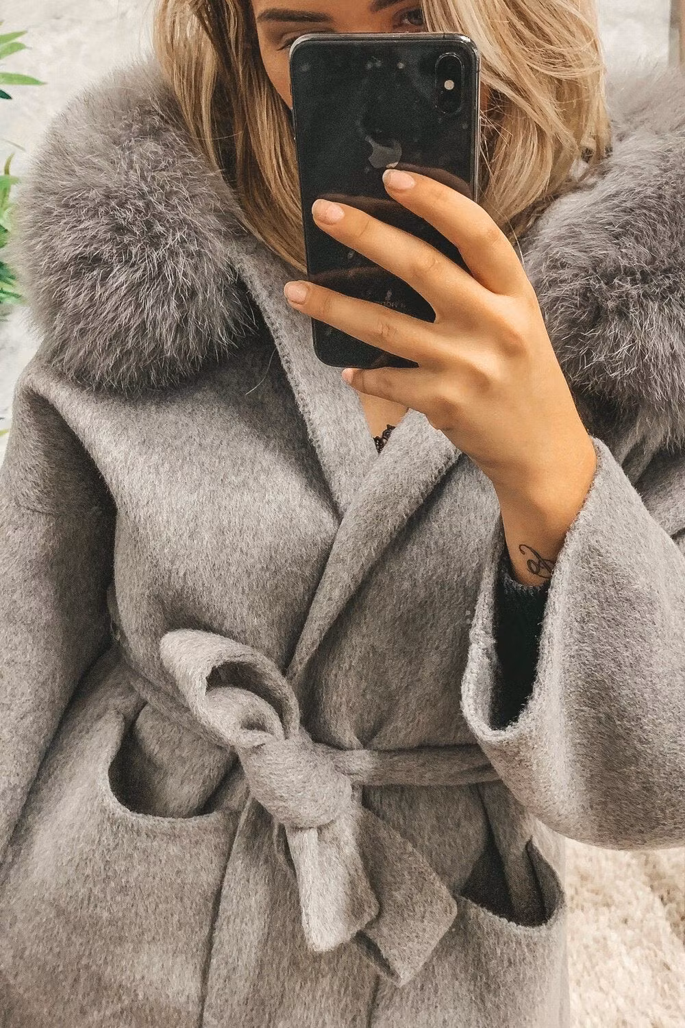 This stylish oversize grey virgin wool coat is sure to become a timeless classic. It features a luxurious big fur collar and a waist band to keep the shape. Keep warm and make your mark in this elegant winter staple.