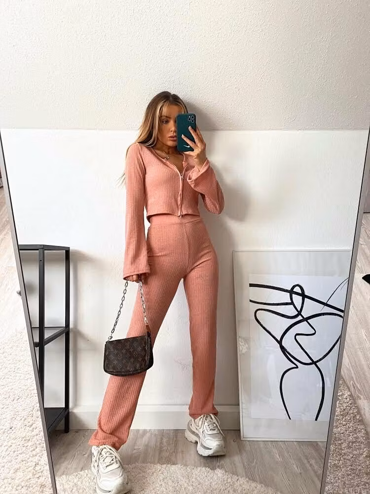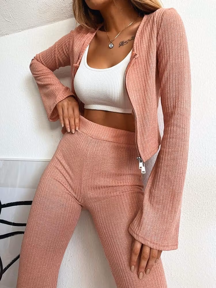 Bekvämt ribbat set, byxor och tröja med dubbla dragkedjor.