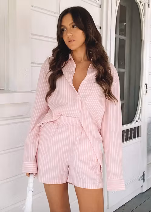 This pink striped shirt is a must-have for any wardrobe. Crafted with recycled materials, it offers a basic and relaxed fit. Its striped pattern is stylish, versatile, and friendly. Perfect for everyday wear.