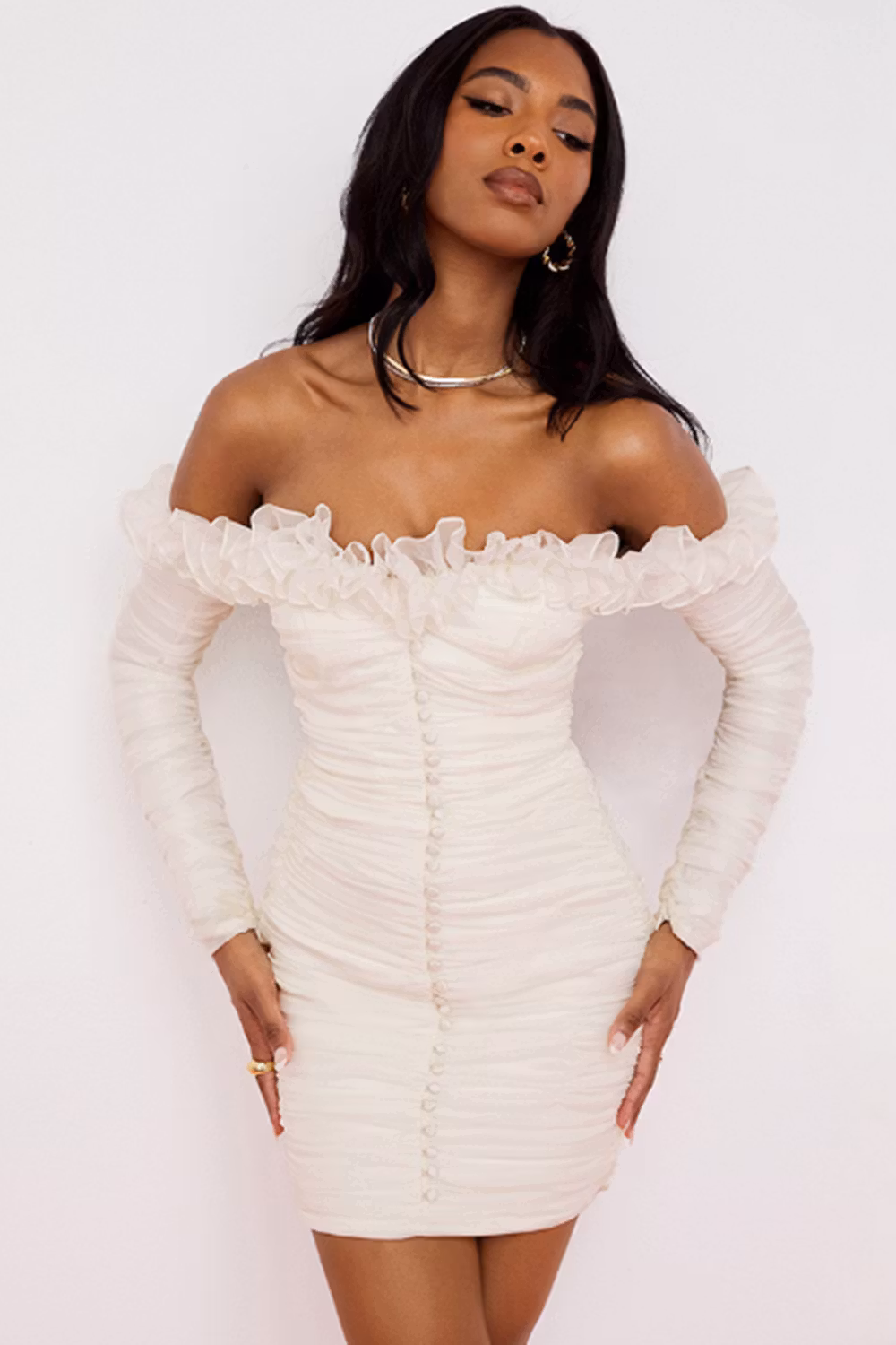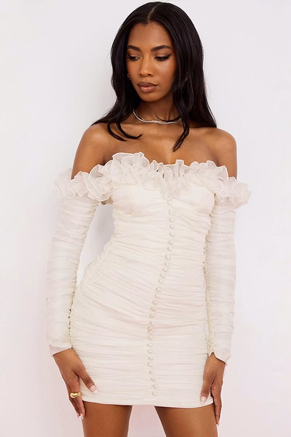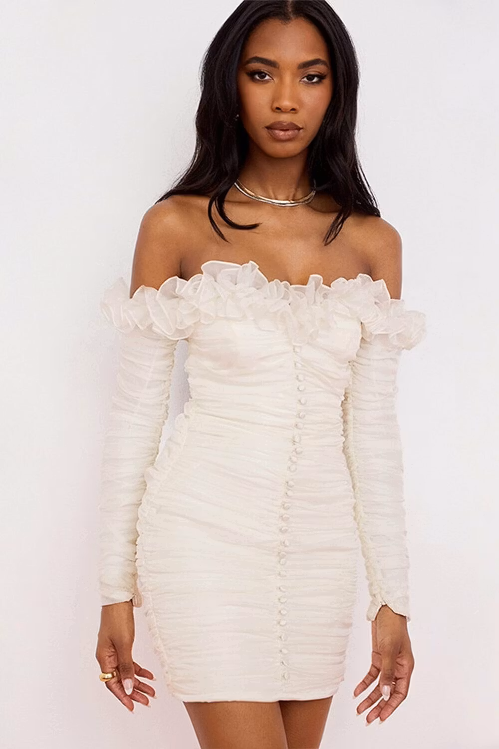 Create a lasting impression with the Virginia Dress - White. This exclusive off-shoulder gown features ruffle details and elegant buttons for a classic look that will make any graduation day memorable. Crafted from high-quality fabric, this dress is guaranteed to look beautiful and last.